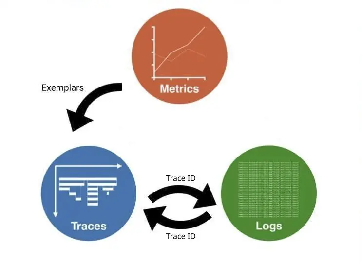 To help understanding an event, the telemetry has attributes to link the various signals. In particular the trace id and the span id (a span is a sub-part of a trace) allow to link traces and logs. But they also link metrics exemplars (aka sampled metrics events) to traces.