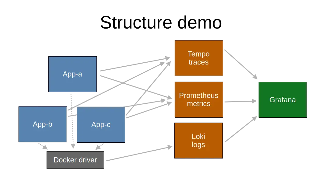 To demonstrate how to use OpenTelemetry with Python services, consider a demo involving three identical microservices using FastAPI that can call each others. Their telemetry is sent to aggregators; Tempo for the traces, Prometheus for the metrics and Loki for the logs.
